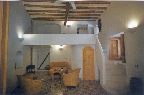 L’abitazione si affaccia su un ampio patio e sul giardino da cui si gode la vista sulla baia di Drautto, di Lipari, Vulcano e la Costa Siciliana.