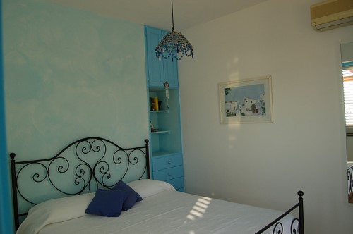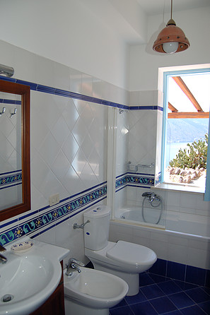 The master bedroom has air conditioning and offers a spectacular view from the window of Salina, Alicudi and Filicudi. The large, well-kept bathroom has a bath and shower.